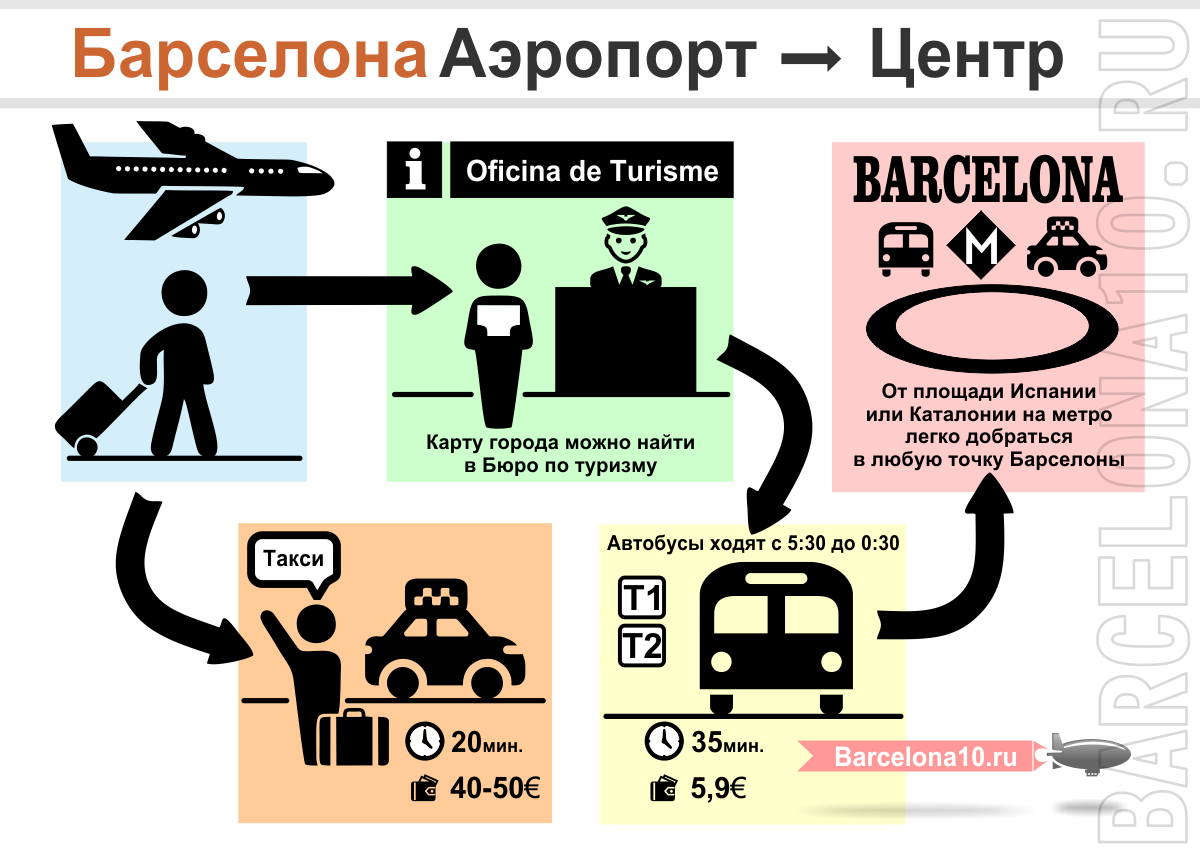 Далее мы опишем способ, как добраться из аэропорта до центра Барселоны на общественном транспорте. Если вы не хотите ехать в автобусе, а потом еще трястись в ужасно душном метро, то можно поступить проще и воспользоваться онлайн-сервисом заказа такси. Водитель встретит вас у терминала, поможет с багажом, а по пути в отель расскажет про город, так как есть вероятность, что он будет знать не только английский, но и русский.